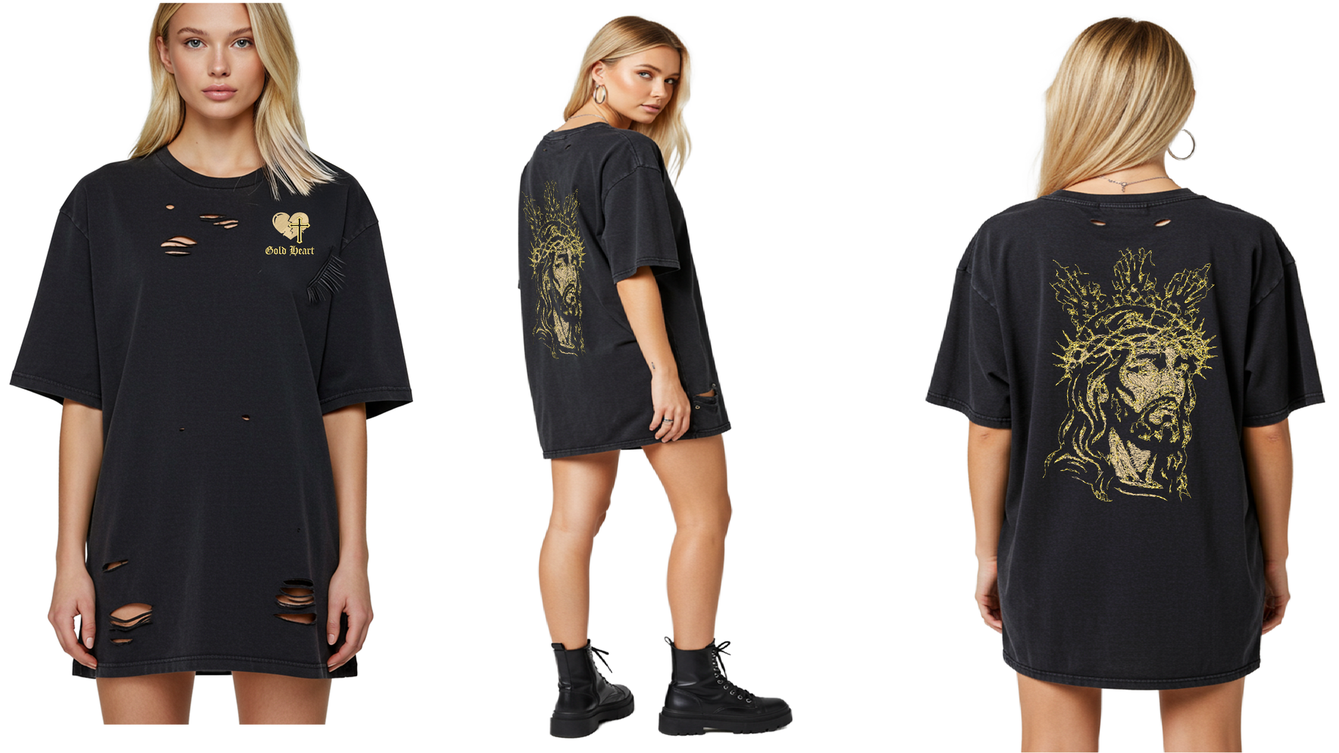 Introducing Crowned King Tee, a testament to strength and resilience. This shirt's striking design features a slightly distressed finish, adding a touch of rugged individuality to the powerful imagery. The shattered heart on the back, held together by an unbreakable golden chain, is a symbol of mending what's broken and embracing imperfections. Both the front and back designs are brought to life with high-quality embroidery, making a bold statement that a spirit remains valuable and strong, no matter the challenges.